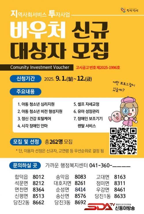¼¼ºÎ ¼ºñ½º ³»¿ë, ½ÅûÀÚ°Ý ±âÁØ ¹× Áö¿ø±Ý¾×Àº ´çÁø½Ã ´©¸®Áý °í½Ã¡¤°ø°í¶õ¿¡¼ È®ÀÎÇÒ ¼ö ÀÖÀ¸¸ç, ¹®ÀÇ»çÇ×Àº °ÅÁÖÁö À¾¡¤¸é¡¤µ¿ ÇàÁ¤º¹Áö¼¾ÅÍ ¸ÂÃãÇü º¹ÁöÆÀÀ̳ª ´çÁø½Ãû »çȸº¹Áö°ú º¹ÁöÁ¤Ã¥ÆÀ(¢Ï041-350-3645)À¸·Î ¹®ÀÇÇÏ¸é ¾È³»¹ÞÀ» ¼ö ÀÖ´Ù.