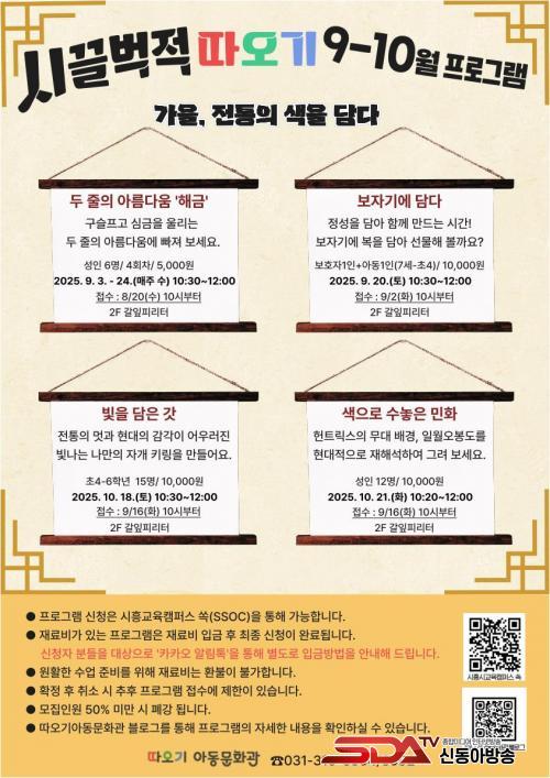 ¶ÇÇÑ, »ó¼³ÇÁ·Î±×·¥µµ ÀüÅë ÁÖÁ¦·Î »õ·Ó°Ô ¼±º¸ÀδÙ. ¾ÆÀ̵éÀÌ ½±°í Áñ°Ì°Ô Âü¿©ÇÒ ¼ö ÀÖµµ·Ï ¡®Á¾ÀÌÄÅÀ¸·Î °« ¸¸µé±â¡¯, ¡®ÀüÅë ¹®¾ç Ä÷¯¸µ¡¯, ¡®ÀÎÇü ÇѺ¹ ÀÔÈ÷±â¡¯ µî üÇèÇü ÇÁ·Î±×·¥ÀÌ ÁغñµÇ¾î ÀÖÀ¸¸ç, À̸¦ ÅëÇØ ÀüÅ빮ȿ¡ ´ëÇÑ Ä£±ÙÇÑ Á¢±Ù°ú âÀÇ·ÂÀ» Ű¿ï ¼ö ÀÖµµ·Ï ÇÒ ¿¹Á¤ÀÌ´Ù.