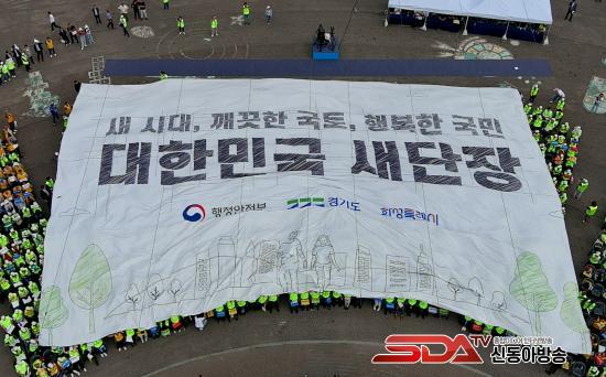 ¡®´ëÇѹα¹ »õ´ÜÀ塯 °áÀÇ ÆÛÆ÷¸Õ½º¿¡¼ Âü¼®ÀÚµéÀº ¡®»õ ½Ã´ë, ±ú²ýÇÑ ±¹Åä, ÇູÇÑ ±¹¹Î! ´ëÇѹα¹ »õ´ÜÀå!¡¯À̶ó´Â ½½·Î°ÇÀÌ ÀûÈù ´ëÇü Çö¼ö¸·À» ¸Ó¸® À§·Î ³Ñ±â´Â ÆÛÆ÷¸Õ½º¸¦ ÆîÄ£ µÚ, ÇÔ²² ±¸È£¸¦ Á¦Ã¢ÇÏ¸ç ±ú²ýÇÑ ´ëÇѹα¹À» ¸¸µé°Ú´Ù´Â ÀÇÁö¸¦ ´ÙÁ³´Ù.