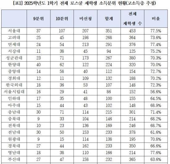 ¡à Çб³º° ºñÀ²Àº ¿µ³²´ë°¡ 77.6%·Î °¡Àå ³ô¾Ò°í ¡ã¼­¿ï´ë¡¤ÀÌÈ­¿©´ë °¢ 77.5% ¡ã¿¬¼¼´ë 77.4% ¡ã¼­°­´ë 75.2% ¡ã°í·Á´ë 73.6% ¡ãÁß¾Ó´ë 72.7% µî ´ëºÎºÐ ¼­¿ï ¼ÒÀç ·Î½ºÄðÀÌ »óÀ§±ÇÀ» Â÷ÁöÇß´Ù. °í¼ÒµæÃþ ºñÀ²ÀÌ »ó´ëÀûÀ¸·Î ÀûÀº Çб³·Î´Â ¡ã¼­¿ï½Ã¸³´ë 56.6% ¡ãµ¿¾Æ´ë 60.2% ¡ãÀü³²´ë 61.6% ¡ãÁ¦ÁÖ´ë 63.1% ¡ãºÎ»ê´ë 63.6% µîÀÌ ²ÅÇû´Ù.