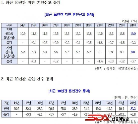 ±¹È¸ ±âȹÀçÁ¤À§¿øÈ¸ ¼Ò¼Ó ´õºÒ¾î¹ÎÁÖ´ç Á¤ÀÏ¿µ ÀÇ¿ø(ÀÎõ ¿¬¼öÀ»)ÀÌ Åë°èûÀ¸·ÎºÎÅÍ Á¦Ãâ¹ÞÀº ÀÚ·á¿¡ µû¸£¸é, ÃÖ±Ù 10³â°£ 1³â ÀÌ»ó È¥ÀÎ½Å°í°¡ Áö¿¬µÈ °Ç¼ö´Â 10.9%(2014³â)¿¡¼ 19.0%(2024³â)·Î ±ÞÁõÇß´Ù. 2³â ÀÌ»ó Áö¿¬µÈ »ç·Êµµ °°Àº ±â°£ 5.2%¿¡¼ 8.8%·Î È®´ëµÆ´Ù. È¥ÀÎ °Ç¼ö ÀÚüµµ 2014³â 30.6¸¸ °Ç¿¡¼ 2024³â 22.2¸¸ °ÇÀ¸·Î 8.4¸¸ °Ç °¨¼ÒÇÏ¸ç ¡®°áÈ¥ ±âÇÇ Çö»ó¡¯ÀÌ Áö¼ÓµÇ°í ÀÖ´Ù.