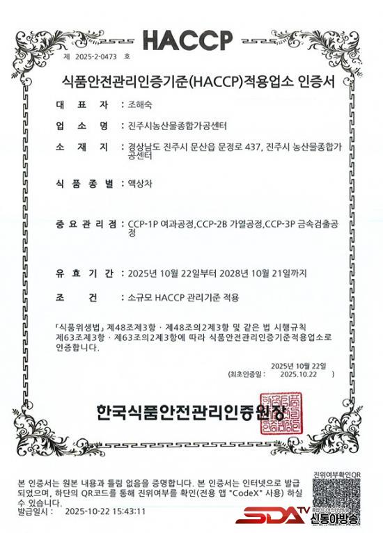 ÁøÁֽà ³ó»ê¹°Á¾ÇÕ°¡°ø¼¾ÅÍ´Â Áö¿ª³ó»ê¹°À» Ȱ¿ëÇØ °¡°øÁ¦Ç° °³¹ß°ú ³ó¾÷ÀÎÀÇ ¼ÒµæÃ¢ÃâÀ» µ½°í ÀÖÀ¸¸ç, Áö³ÇØ 7¿ù °úäÁÖ½º·ù¿Í ĵµð·ù 2°³ À¯Çü¿¡ ´ëÇØ ¡®HACCP¡¯ ÀÎÁõÀ» ¹ÞÀº ÈÄ, ¿ÃÇØ 10¿ù 22ÀÏ Àë·ù¿Í ¾×»óÂ÷ 2°³ À¯ÇüÀ» Ãß°¡·Î ÀÎÁõ¹Þ¾Æ ³ó»ê¹°Á¾ÇÕ°¡°ø¼¾ÅÍ¿¡¼ »ý»êµÇ´Â Á¦Ç°ÀÇ ¾ÈÀü¼º°ú ½Å·Úµµ¸¦ ÇÑÃþ ´õ ³ô¿´´Ù.