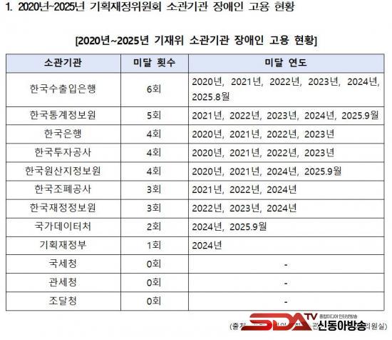 Çѱ¹Åë°èÁ¤º¸¿øÀº 2020³âÀ» Á¦¿ÜÇÏ°í ¸Å³â Àǹ«°í¿ë·üÀ» ´Þ¼ºÇÏÁö ¸øÇß´Ù. ƯÈ÷ 2021³â°ú 2022³â¿¡´Â °í¿ëÇØ¾ß ÇÒ Àå¾ÖÀÎ 3¸íÀ» ´Ü ÇÑ ¸íµµ °í¿ëÇÏÁö ¾Ê¾Æ ¾à 9,700¸¸¿øÀÇ °í¿ëºÎ´ã±ÝÀ» ³³ºÎÇß´Ù. 2023³â°ú 2024³â¿¡µµ Àǹ«°í¿ëÀοø¿¡ ¹ÌÄ¡Áö ¸øÇØ 7,700¸¸¿øÀÇ ºÎ´ã±ÝÀÌ Ãß°¡·Î ºÎ°úµÇ¾ú´Ù.