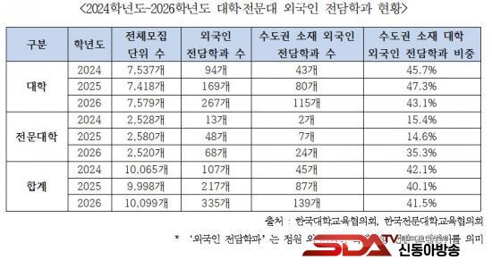 ¡à Àüü ¿Ü±¹ÀÎ Àü´ãÇаú´Â 2024³âÇг⵵ 107°³¿¡¼­ 2026³âÇг⵵ 335°³·Î ´Ã¾ú´Ù. ÀÌ °¡¿îµ¥ ¼öµµ±Ç ´ëÇÐÀº 43°³¿¡¼­ 115°³, Àü¹®´ëÇÐÀº 2°³¿¡¼­ 24°³·Î ±ÞÁõÇß´Ù. ¼öµµ±Ç ºñÁßÀº 42.1%(¡¯24) ¡æ 40.1%(¡¯25) ¡æ 41.5%(¡¯26)·Î ³ªÅ¸³ª ¿Ü±¹ÀÎ Àü´ãÇаúÀÇ ¼öµµ±Ç ½ò¸²ÀÌ µÎµå·¯Á³´Ù.
