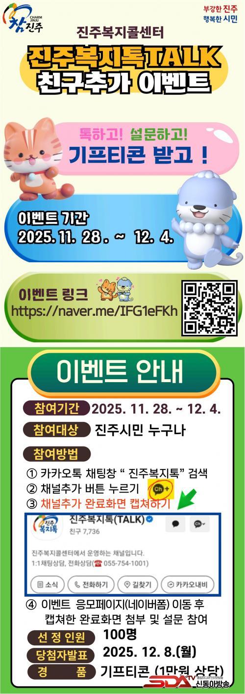 ÁøÁֽô ½Ã¹Î°úÀÇ ¼ÒÅëÀ» °­È­ÇÏ°í º¹Áö¼­ºñ½º Á¢±Ù¼ºÀ» ³ôÀ̱â À§ÇØ ÁøÁÖº¹ÁöÄݼ¾ÅÍ(ÀÌÇÏ Äݼ¾ÅÍ)¿¡¼­ ¿î¿µÇÏ´Â ¡®ÁøÁÖº¹ÁöÅå(TALK)¡¯ ä³ÎÀÇ ¡®Ä£±¸Ãß°¡ À̺¥Æ®¡¯¸¦ 28ÀϺÎÅÍ ¿À´Â 12¿ù 4ÀϱîÁö 7Àϰ£ ÁøÇàÇÑ´Ù°í ¹àÇû´Ù.
