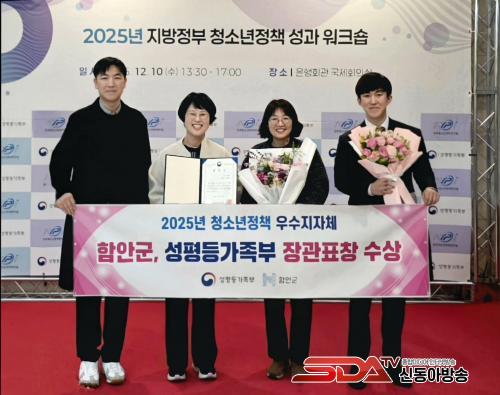 [½Åµ¿¾Æ¹æ¼Û °æ³²ÇÔ¾È=À̽ŵ¿±âÀÚ] ÇԾȱºÀº Áö³­ 10ÀÏ ¼­¿ï Áß±¸ ÀºÇàȸ°ü¿¡¼­ ¿­¸° ¡®2025³â û¼Ò³âÁ¤Ã¥ ¿ì¼öÁöÀÚü Æ÷»ó Àü¼ö½Ä¡¯¿¡¼­ ¡®2025³â û¼Ò³âÁ¤Ã¥ ¿ì¼öÁöÀÚü¡¯·Î ¼±Á¤µÅ ¼ºÆòµî°¡Á·ºÎÀå°ü ǥâÀ» ¼ö»óÇß´Ù. À̹ø ¼ö»óÀº 2024³â ´ëÅë·É ǥâ¿¡ À̾î 2³â ¿¬¼Ó ¿ì¼öÁöÀÚü·Î À̸§À» ¿Ã¸° ¼º°ú´Ù.