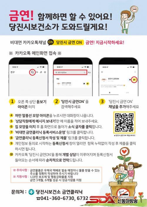 ÇÑÆí, ±Ý¿¬ Ŭ¸®´Ð°ú °ü·ÃÇÑ ÀÚ¼¼ÇÑ »çÇ×Àº ´çÁø½Ãº¸°Ç¼Ò °Ç°ÁõÁø°ú °Ç°°ü¸®ÆÀ ±Ý¿¬Å¬¸®´Ð(¢Ï041-360-6730, 6732)À¸·Î ¹®ÀÇÇϰųª īī¿ÀÅå ä³Î ¡®´çÁø½Ã ±Ý¿¬¿Â(ON)¡¯À» ÀÌ¿ëÇØ ¾È³»¹ÞÀ» ¼ö ÀÖ´Ù.