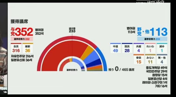 9ÀÏ NHK µî ÀϺ» ¾ð·Ð¿¡ µû¸£¸é, ÀڹδçÀº À̹ø ¼±°Å¿¡¼ ±âÁ¸ 198¼®¿¡¼ 118¼®ÀÌ ´Ã¾î³ Àüü 465¼® Áß ÀüÀï °¡´É ±¹°¡·Î °³ÇåÀÌ °¡´ÉÇÑ 3ºÐÀÇ 2ÀÎ 310¼®À» ³Ñ¾î 316¼®À» Â÷ÁöÇϸé¼, ´ÙÄ«ÀÌÄ¡ÀÇ Àå±â Áý±Ç Åä´ë±îÁö ¸¶·ÃÇÑ °ÍÀ¸·Î Æò°¡µÆ´Ù.