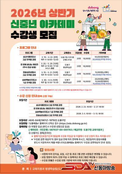 [½Åµ¿¾Æ¹æ¼Û µµºÀ±¸=À̽ŵ¿±âÀÚ] ¼­¿ï µµºÀ±¸°¡ 2026³â »ó¹Ý±â ½ÅÁ߳⠾ÆÄ«µ¥¹Ì ¼ö°­»ýÀ» ¸ðÁýÇÑ´Ù. À̹ø »ó¹Ý±â´Â ½ÅÁß³âµéÀÌ Á¦2ÀÇ ÀλýÀ» ÁغñÇÒ ¼ö ÀÖ´Â ÀλýÀç¼³°è °úÁ¤°ú Á÷¾÷ ¿ª·® °­È­¸¦ À§ÇÑ °­ÀÇ·Î ±¸¼ºµÈ´Ù.