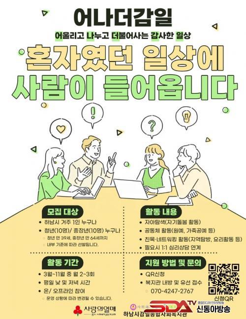 <¾î³ª´õ °¨ÀÏ>Àº ¡ãÀڱ⵹º½ Ȱµ¿(ÀÚ¾ÆÅ½»ö Ȱµ¿ µî) ¡ãÁ¤¼Áö¿ø Ȱµ¿ ¡ã¿¬·Éº° ¸ÂÃã Æ¯È ÇÁ·Î±×·¥(°¡Á×°ø¿¹, ¿ä¸®±³½Ç µî) ¡ãÀÚÁ¶¸ðÀÓ ¿î¿µ(Áö¿ªÅ½¹æ µî) ¡ã1:1 Àü¹® ½É¸®»ó´ã ¿¬°è µîÀ¸·Î ±¸¼ºµÈ´Ù. Âü¿©ÀÚ´Â ÇÁ·Î±×·¥À» ÅëÇØ ÀÚ½ÅÀ» µ¹¾Æº¸°í, ŸÀΰúÀÇ ±³·ù¸¦ °æÇèÇϸç, Áö¿ª»çȸ ±¸¼º¿øÀ¸·Î¼ÀÇ ¼Ò¼Ó°¨À» ȸº¹ÇÏ´Â ±âȸ¸¦ °®°Ô µÈ´Ù.