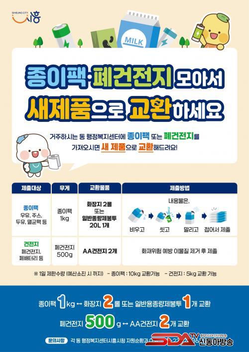 ¿ìÀ¯ ÆÑ, ÁÖ½º ÆÑ, µÎÀ¯ ÆÑ, ¸ê±Õ ÆÑ µî Á¾ÀÌ ÆÑÀº ¡®³»¿ë¹°À» ºñ¿ì°í ¹°·Î Çó±º µÚ °ÇÁ¶ÇØ ÆîÄ£ »óÅ¡¯·Î °üÇÒ µ¿ ÇàÁ¤º¹Áö¼¾ÅÍ¿¡ °¡Á®¿À¸é µÈ´Ù. Á¾ÀÌ ÆÑÀº 1§¸´ç ÈÀåÁö 2·Ñ ¶Ç´Â Á¾·®Á¦ºÀÅõ(ÀÏ¹Ý 20§¤) 1ÀåÀ¸·Î ±³È¯µÇ¸ç, 1Àδç 1ÀÏ ÃÖ´ë 10§¸±îÁö °¡´ÉÇÏ´Ù. Æó°ÇÀüÁö´Â ÈÀç ¿¹¹æÀ» À§ÇØ À̹°ÁúÀ» Á¦°ÅÇÑ ÈÄ Á¦ÃâÇϸé 500g´ç AA °ÇÀüÁö 2°³·Î ±³È¯ÇÒ ¼ö ÀÖÀ¸¸ç, 1Àδç 1ÀÏ ÃÖ´ë 5§¸±îÁö ±³È¯ÀÌ °¡´ÉÇÏ´Ù.