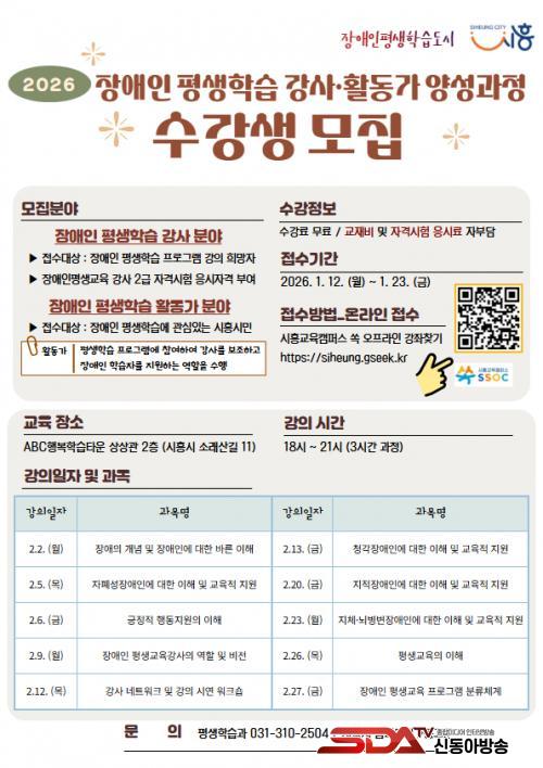 ¸ðÁý ÀοøÀº Àå¾ÖÀÎ Æò»ýÇнÀ Àü¹® °»ç 40¸í°ú Àå¾ÖÀÎ Æò»ýÇнÀ Ȱµ¿°¡ 10¸íÀÌ´Ù. Àü¹® °»ç´Â Àå¾ÖÀÎ Æò»ýÇнÀ ÇÁ·Î±×·¥ °ÀÇ Èñ¸ÁÀڷμ ½Åû ¸¶°¨ÀϱîÁö ½ÃÈï½Ã °»çÀºÇà¿¡ µî·ÏµÈ °»ç¿¡ ÇÑÇØ ½ÅûÇÒ ¼ö ÀÖÀ¸¸ç, Ȱµ¿°¡´Â Àå¾ÖÀÎ Æò»ýÇнÀ¿¡ °ü½É ÀÖ´Â ½ÃÈï½Ã¹ÎÀÌ¸é ´©±¸³ª Áö¿øÇÒ ¼ö ÀÖ´Ù.