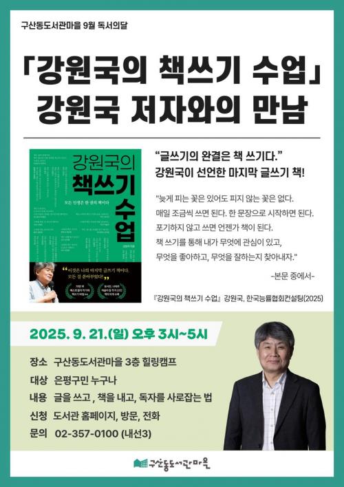 [½Åµ¿¾Æ¹æ¼Û ÀºÆò±¸=À̽ŵ¿±âÀÚ] ¼­¿ï ÀºÆò±¸´Â ±¸»êµ¿µµ¼­°ü¸¶À»¿¡¼­ ¿À´Â 21ÀÏ ¿ÀÈÄ 3½Ã¿¡ ¡®°­¿ø±¹ÀÇ Ã¥¾²±â ¼ö¾÷¡¯ °­¿ø±¹ ÀúÀÚ¿ÍÀÇ ¸¸³²À» °³ÃÖÇÑ´Ù°í ¹àÇû´Ù. 9¿ù µ¶¼­ÀÇ ´ÞÀ» ¸Â¾Æ ¸¶·ÃµÈ À̹ø °­¿¬Àº ¡®ÀÌ´ÞÀÇ Àι®ÇС¯ ÇÁ·Î±×·¥ Áß Çϳª·Î ±¸¹ÎµéÀÌ Ã¥°ú ´õ¡¦