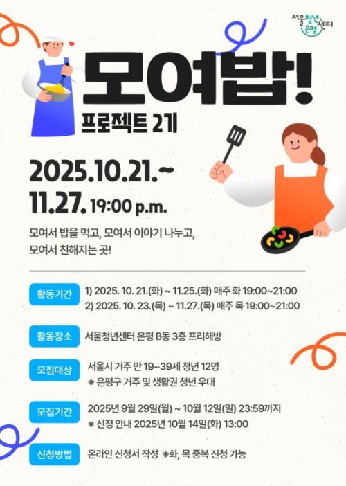 [½Åµ¿¾Æ¹æ¼Û ÀºÆò±¸=À̽ŵ¿±âÀÚ] ¼­¿ï ÀºÆò±¸´Â ¼­¿ïû³â¼¾ÅÍ ÀºÆòÀÌ ¿ä¸®¿Í ºÀ»ç¸¦ °áÇÕÇÑ Ã»³â Ä¿¹Â´ÏƼ ÇÁ·Î±×·¥ ¡®¸ð¿©¹ä¡¯ÀÇ 2±â Âü¿© û³âÀ» ¿À´Â 12ÀϱîÁö ¸ðÁýÇÑ´Ù°í ¹àÇû´Ù. ¡®¸ð¿©¹ä¡¯Àº û³âÀÇ ½Ä»ýȰ Áö¿ø°ú ´õºÒ¾î »çȸÀû °í¸³°¨ ÇØ¼Ò¿Í ¼ºÃë°¨À» Á¦°øÇÏ¡¦