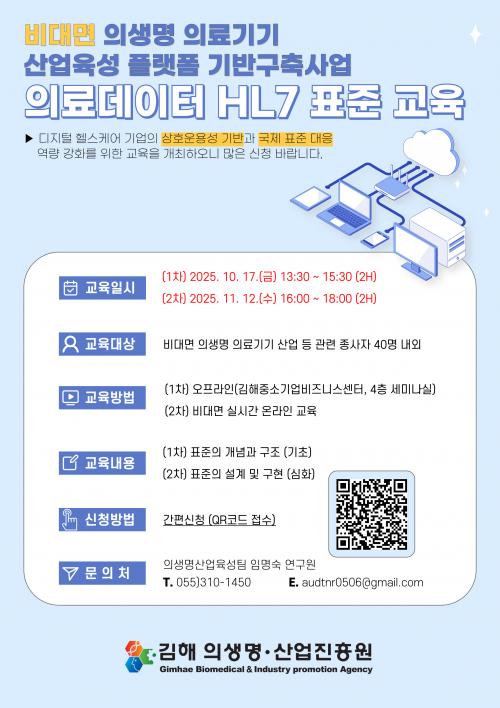 [½Åµ¿¾Æ¹æ¼Û °æ³²±èÇØ=³²±Ã¿µ±â±âÀÚ] ±èÇØÀÇ»ý¸í¡¤»ê¾÷ÁøÈï¿øÀº HL7 Korea¿Í Áö³­ÇØ 7¿ù 5ÀÏ Ã¼°áÇÑ ¡¸»óÈ£¿î¿ë¼º½ÃÇè Çù·Âü°è ±¸Ãà ¾÷¹«Çù¾à(MOU)¡¹ÀÇ ÈÄ¼Ó Á¶Ä¡·Î, Àü±¹ ºñ´ë¸é ÀÇ·á±â±â ¹× µðÁöÅÐ ÇコÄÉ¾î °ü·Ã Á¾»çÀÚ¸¦ ´ë»óÀ¸·Î ¡®ÀÇ·áµ¥ÀÌÅÍ HL7 Ç¥ÁØ ±³À° ÇÁ·Î¡¦