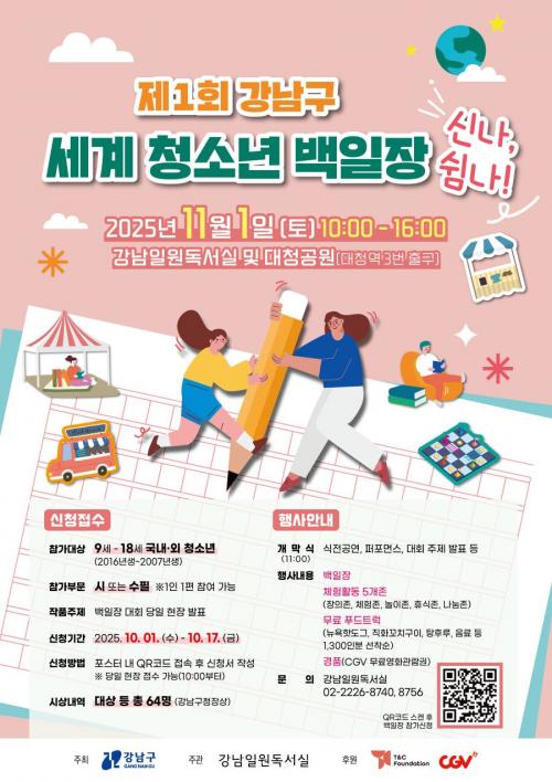 [½Åµ¿¾Æ¹æ¼Û °­³²±¸=À̽ŵ¿±âÀÚ] ²ÞÀÌ ¸ðÀÌ´Â µµ½Ã, ¹Ì·¡¸¦ ±×¸®´Â °­³²±¸°¡ ¿À´Â 11¿ù 1ÀÏ ¿ÀÀü 10½ÃºÎÅÍ ¿ÀÈÄ 4½Ã±îÁö °­³²ÀÏ¿øµ¶¼­½Ç°ú ´ëû°ø¿ø ÀÏ´ë¿¡¼­ ¡®Á¦1ȸ °­³²±¸ ¼¼°èû¼Ò³â¹éÀÏÀå ½Å³ª, ½°³ª!¡¯¸¦ °³ÃÖÇÑ´Ù. ÀÌ Çà»ç´Â ±¹³»‧¿Ü ±¹Àû û¼Ò³âÀÌ ÇÔ²²ÇÏ¡¦