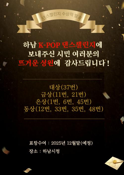 [½Åµ¿¾Æ¹æ¼Û Çϳ²½Ã=À̽ŵ¿±âÀÚ] µµ½É °÷°÷À» ¹è°æÀ¸·Î, ½Ã¹ÎµéÀÌ ÃãÀ¸·Î ¿Ï¼ºÇÑ ¡®Çϳ² K-POP ´í½º 縰Áö¡¯°¡ ¶ß°Å¿î ¿­±â ¼Ó¿¡ ¸·À» ³»·È´Ù. ½Ã´Â 11¿ù 5ÀϺÎÅÍ 26ÀϱîÁö ÁøÇàµÈ ¡®Çϳ² K-POP ´í½º 縰Áö¡¯ÀÇ ÃÖÁ¾ ¼ö»óÀÛ 10°³ ÆÀ(¶Ç´Â °³ÀÎ)À» ¼±Á¤Çß´Ù°í 1ÀÏ ¹àÇû¡¦