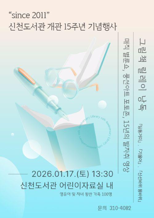 [½Åµ¿¾Æ¹æ¼Û ½ÃÈï½Ã=À̽ŵ¿±âÀÚ] ½ÃÈï½Ã´Â ¿À´Â 1¿ù 17ÀÏ ½Åõµµ¼­°ü¿¡¼­ ¡®°³°ü 15Áֳ⠱â³äÇà»ç¡¯¸¦ ¿­°í, À¯¾Æµ¿ ¹× ¾î¸°ÀÌ µ¿¹Ý °¡Á· 100¿© ¸íÀ» ´ë»óÀ¸·Î ±×¸²Ã¥ ³¶µ¶°ú ¸¶¼ú °ø¿¬À» ¿î¿µÇÑ´Ù. Çà»ç´Â À̳¯ ¿ÀÈÄ 1½Ã 30ºÐºÎÅÍ 3½Ã 30ºÐ±îÁö ÁøÇàµÈ´Ù. À̹ø Çà»ç¡¦