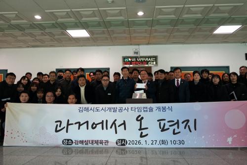 [½Åµ¿¾Æ¹æ¼Û °æ³²±èÇØ=³²±Ã¿µ±â±âÀÚ] ±èÇØ½Ãµµ½Ã°³¹ß°ø»ç(ÀÌÇÏ °ø»ç)´Â Áö³­ 27ÀÏ ±èÇØ½Ç³»Ã¼À°°ü ÀÔ±¸¿¡¼­ ⸳ 2ÁÖ³âÀ» ¸Â¾Æ ºÀÀÎÇß´ø ŸÀÓĸ½¶À» °³ºÀÇÏ´Â Çà»ç¸¦ ¿­°í, 10³â Àü ÀÓÁ÷¿øµéÀÌ ³²±ä ÆíÁö¸¦ Àü´ÞÇß´Ù. À̹ø Çà»ç´Â 2016³â °ø»ç ⸳ Ãʱ⠱¸¼º¿øµéÀÌ¡¦